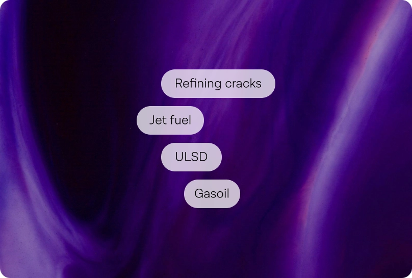 Our models cover all major benchmarks: NYMEX ULSD (Heating Oil) as the primary jet fuel proxy, Gulf Coast Jet Fuel, Singapore Jet Kero, ICE Gasoil, Brent and WTI cracks, and regional into-plane differentials.
